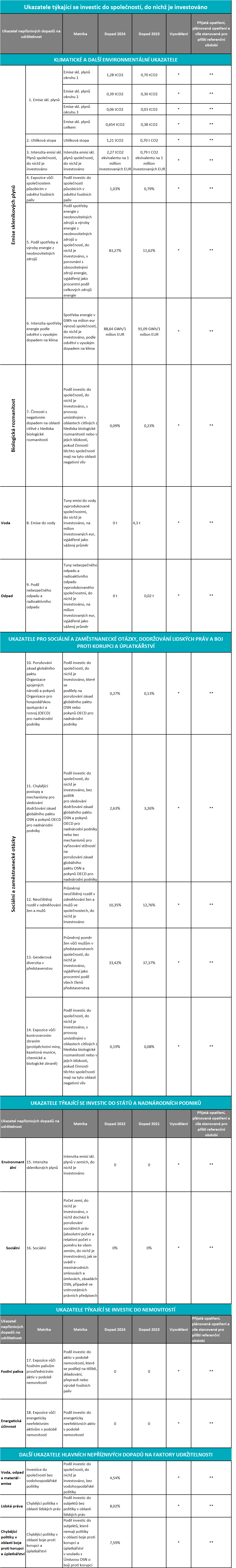 * Vysvětlení: Údaje za poslední dvě sledovaná období naleznete níže. Seznam společností, do nichž je investováno, se oproti předchozímu mírně změnil, a to napříč jednotlivými fondy. Dopad na jednotlivé ukazatele je různý. Naším cílem je postupné zlepšování jednotlivých ukazatelů, nicméně nikoliv na úkor atraktivity produktů pro naše investory, zejména co se týče produktů, které prosazují environmentální a sociální vlastnosti.